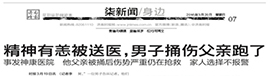 【新闻直击】“事发突然,刚到医院门口,男子突然拿刀捅伤父亲后逃离,都在转瞬之间发生。”20日上午,济南神康医院院长张淑芹表示,19日上午发生的聊城男子刘某“就医刺父”事情让她和同事都深感痛心,尽管男子第一次来医院,尚未在医院接受任何检查就出事,但综合家人讲诉和患者表现,高度疑似典型精神疾病患者,丧失自知力。
