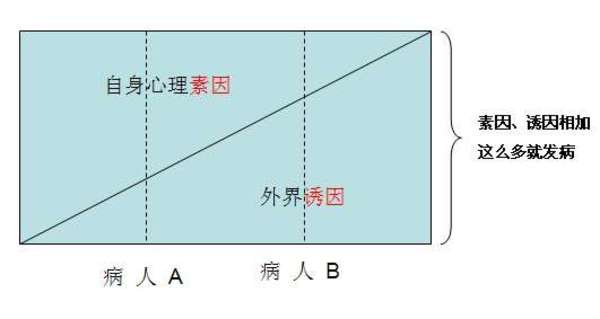和国内多位学者采用过)所示,病人A的自身心理因素多一些,而病人B外界因素多一些,即便B的自身心理因素很好,但是外界的诱因太大,也会发病。而本身就有很大心理问题的A,尽管外界因素很少,一点小挫折或委屈,也会发病,心情不好,持续很长时间,至少2-4周以上。换个角度,心理能力或素质越好,就需要越大的外界诱因,才可发病,一般一点小挫折或委屈,可能当时心里难受几小时或几天,随后自我稍加调整就好了,该干啥去干啥,生活工作又回到正常轨道了。